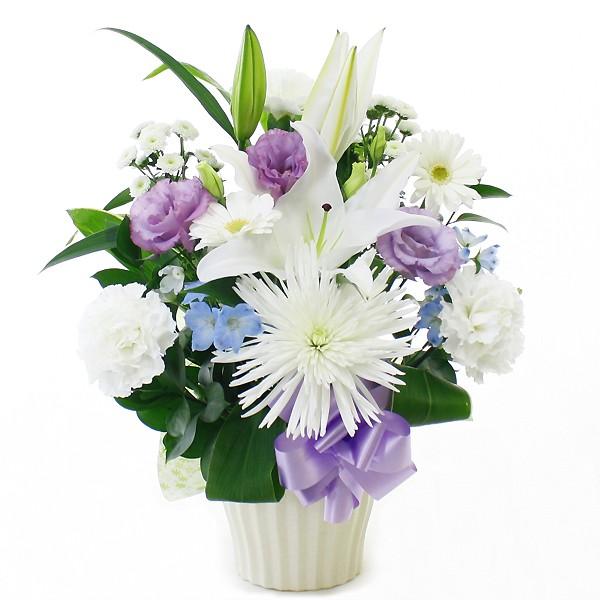 お供えアレンジ リスペクト 白 紫系 花 フラワーギフト 送料無料 弔事 お供え 弔花 お悔み 宅配
