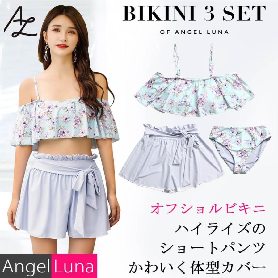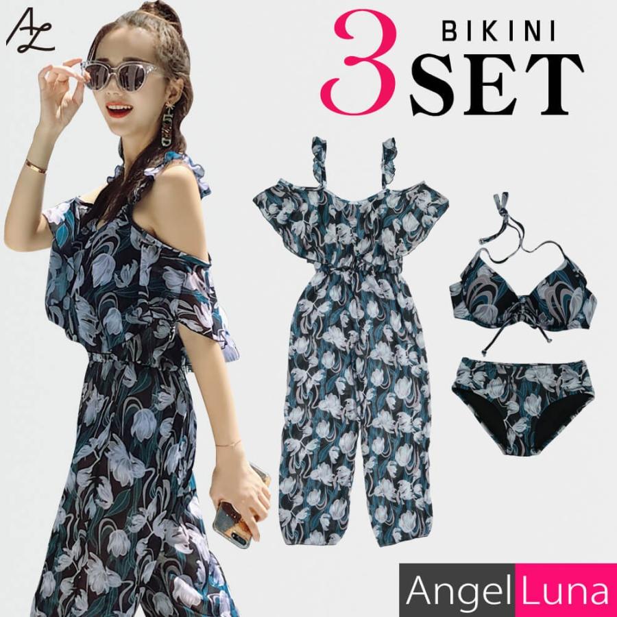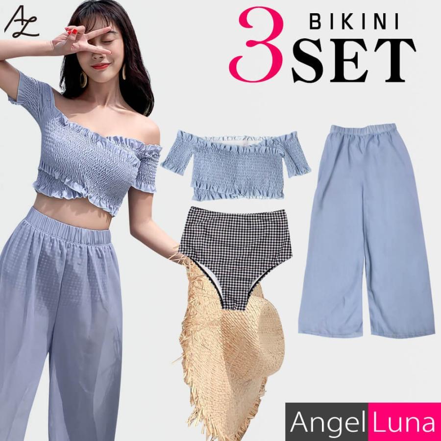 水着 レディース ビキニ ワイドパンツ付 上下3点セット ノンワイヤー パット内蔵 ライトブルー ネイビー m l 体型カバー オフショル シフォン al77008 水着専門店エンジェル ルナ 通販 yahoo ショッピング