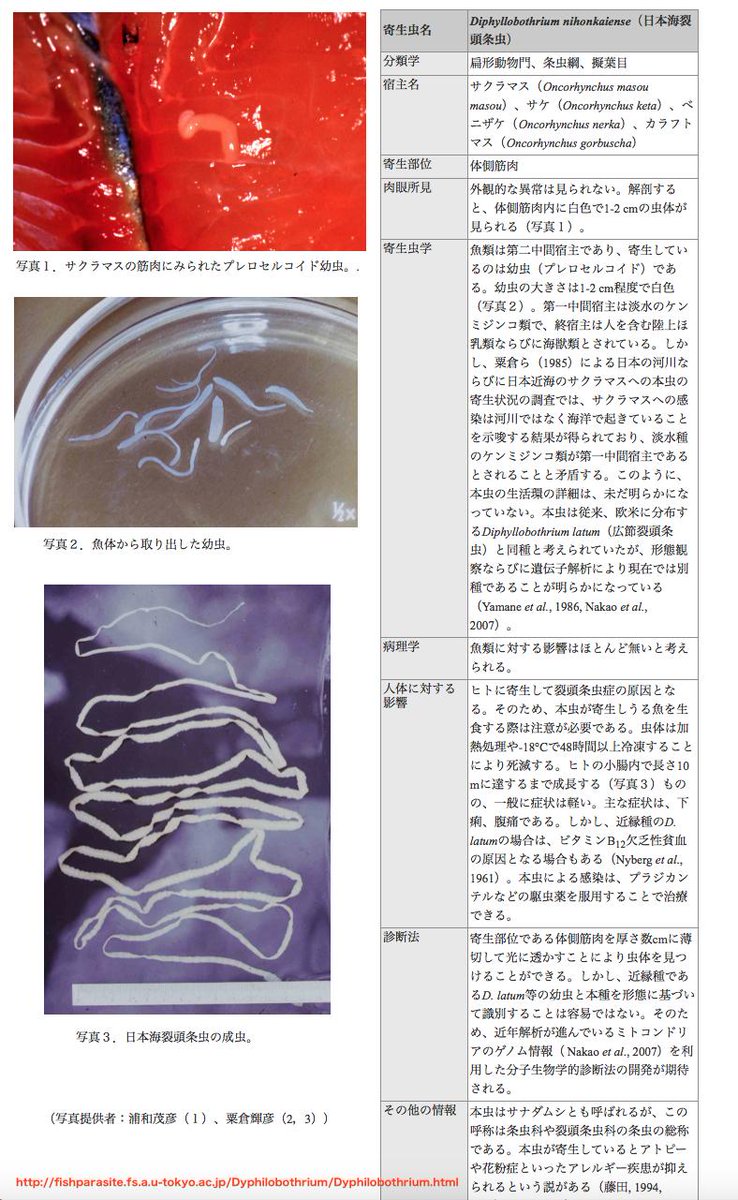 takuro on twitter サケ は中間宿主で 寄生虫 も幼虫のため 同定は難しいらしい 4つの吸盤でヒットするのは吸葉条虫属の幼虫phyllobothriumかtetraphyllidea https t co ftfctwabtr 鮭の腹側筋肉や内臓でよく見るのは画像3の扁平なタイプ これは サナダムシ