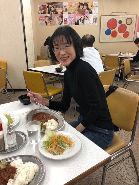 芥川賞を受賞した石井遊佳さんに今日も来社いただきました 昼食はnhk サラメシ の放送でも話題になった小社の食堂へ 今日のメニューはハヤシライスです これで200円 安くて美味しいです とほめていただきました 受賞作 百年泥 は本日から全国の書店