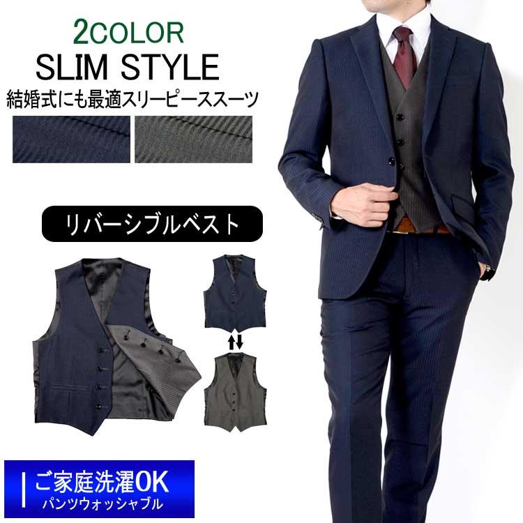 スリーピーススーツ リバーシブルベスト オールシーズン スリムスタイル 3ピース ご家庭で洗濯可能なスラックス y体 a体 ab体 bb体 2ツボタン 結婚式 2次会 d1033 スーツのアウトレット工場 通販 yahoo ショッピング