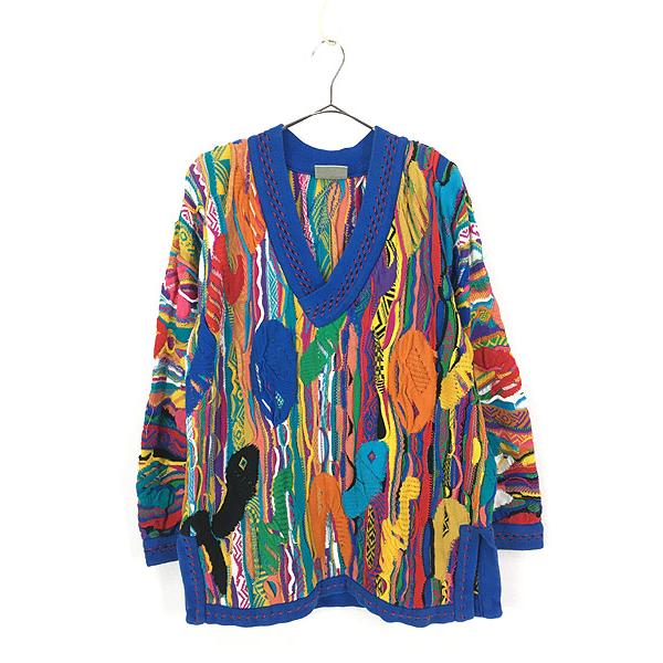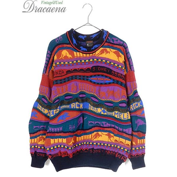 古着 ニット オーストラリア製 coogi風 3d ランダム ボーダー ふわふわ 肉厚 ウール ニット セーター l位 古着