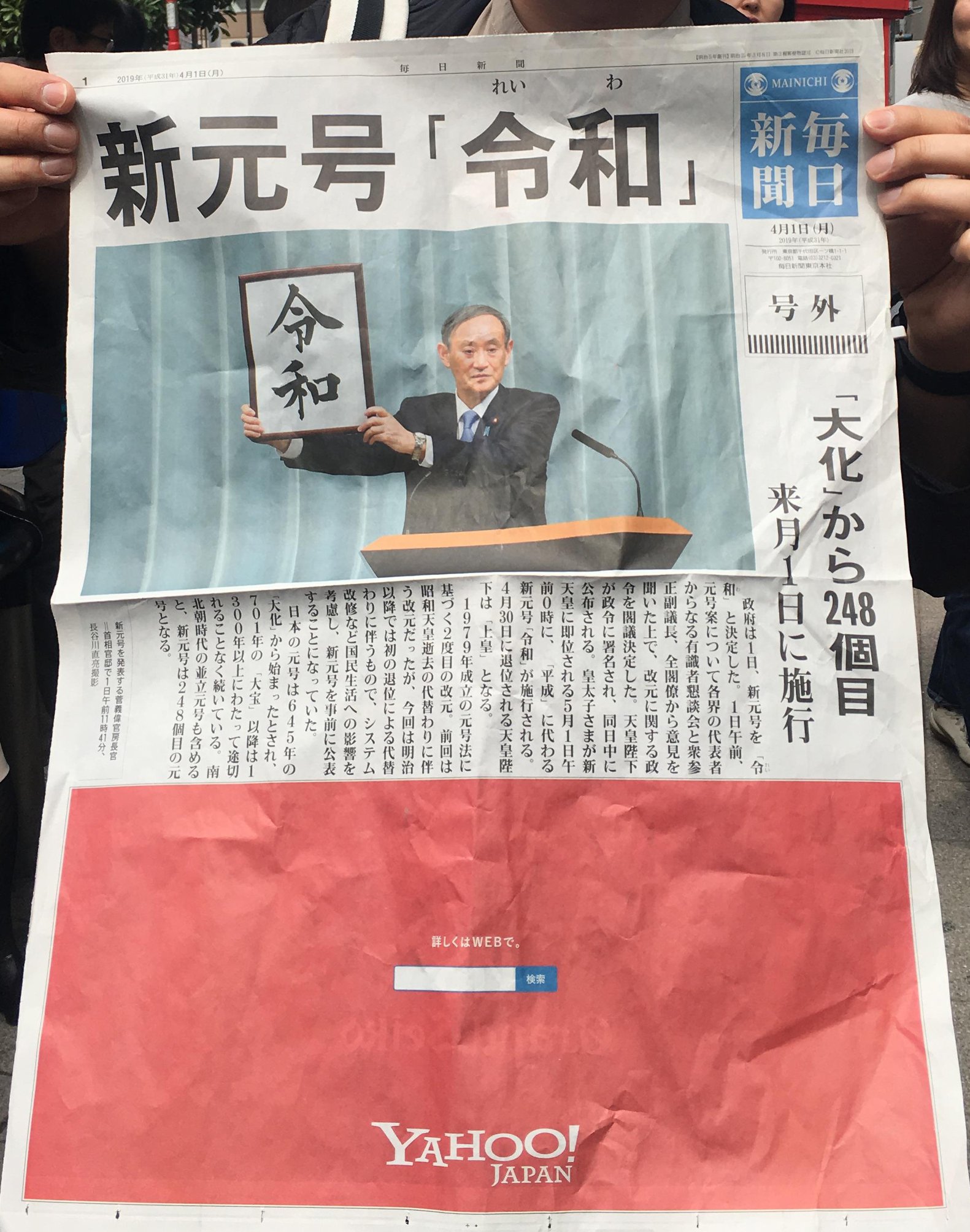 山形新聞 号外 本紙 記念包装新聞付 平成31年4月2日 令和 新元号 地方紙マニア 新品 宅配用完全版 令和おじさん 菅義偉