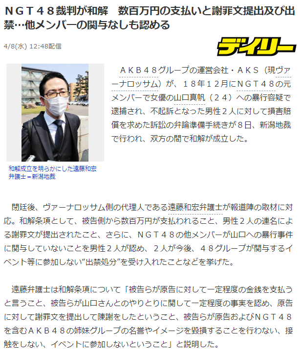 ngt48山口真帆さん暴行事件で不起訴となった男2人を提訴 運営会社 aks が損害賠償請求 日刊ニュース